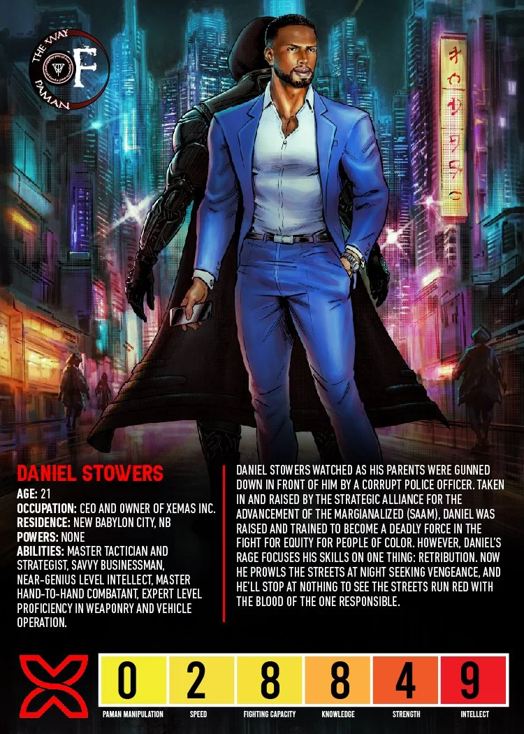 Left unconscious, he was found by Percy Howard, a former militant activist from the late 60’s and 70’s. Taken in by Percy, he was trained in various disciplines from hand-to-hand combat to corporate espionage by members of the group that Percy led: SAAM - The Strategic Alliance for the Advancement of the Marginalized.
